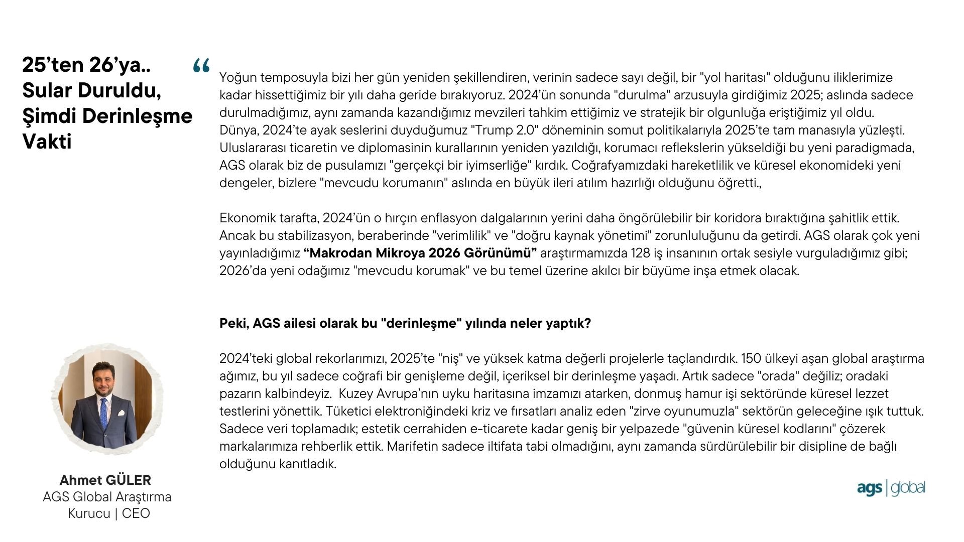 AGS Global'den zorluklarla dolu geçen 2025'e veda, yeni ve ilham verici bir yıl olmasını temenni ettiğimiz 2026'ya ise merhaba yazısı. Kurucumuz Ahmet Güler kaleme aldı. Mutlu yıllar, keyifli okumalar!
