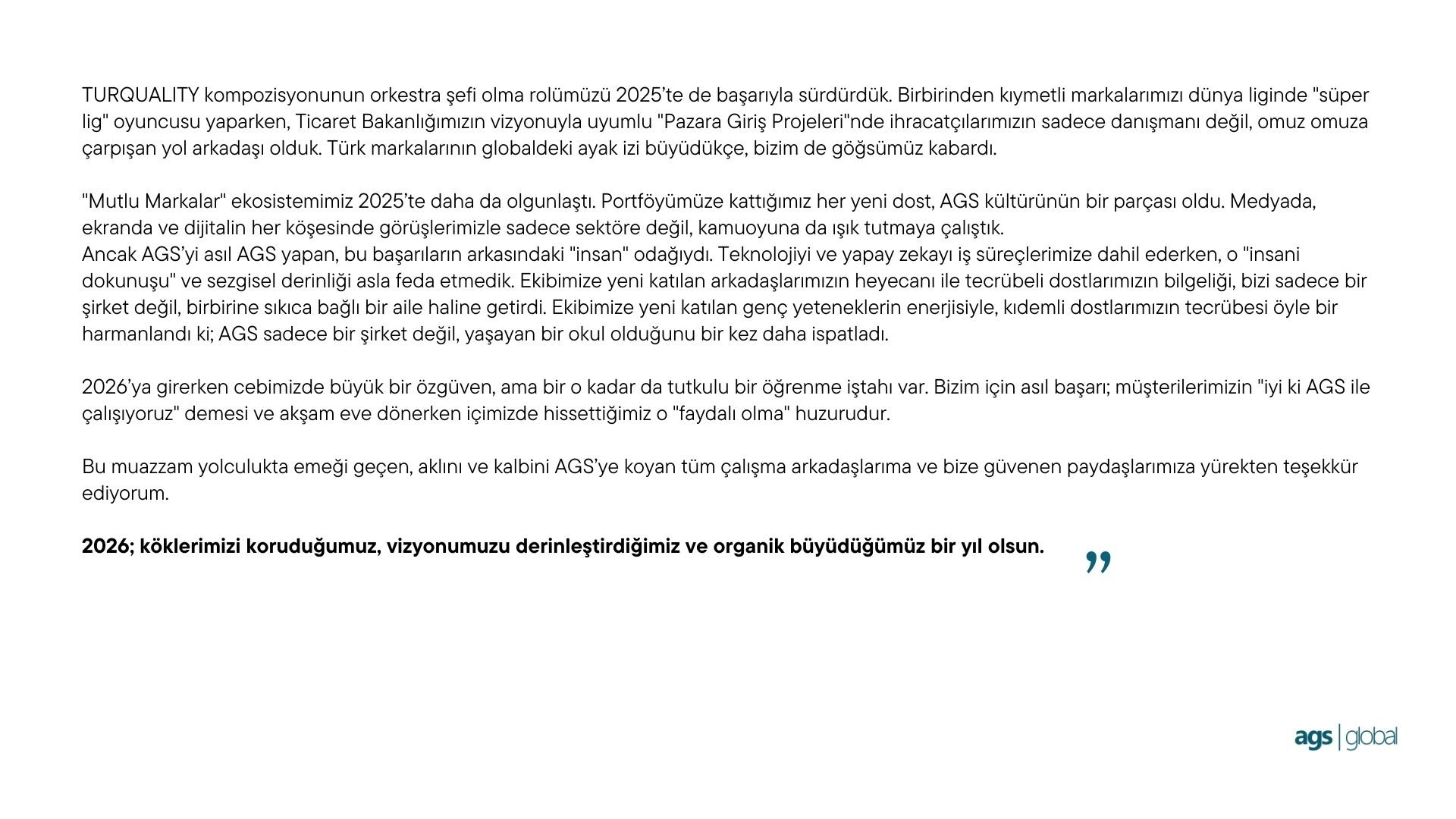 AGS Global'den zorluklarla dolu geçen 2025'e veda, yeni ve ilham verici bir yıl olmasını temenni ettiğimiz 2026'ya ise merhaba yazısı. Kurucumuz Ahmet Güler kaleme aldı. Mutlu yıllar, keyifli okumalar!