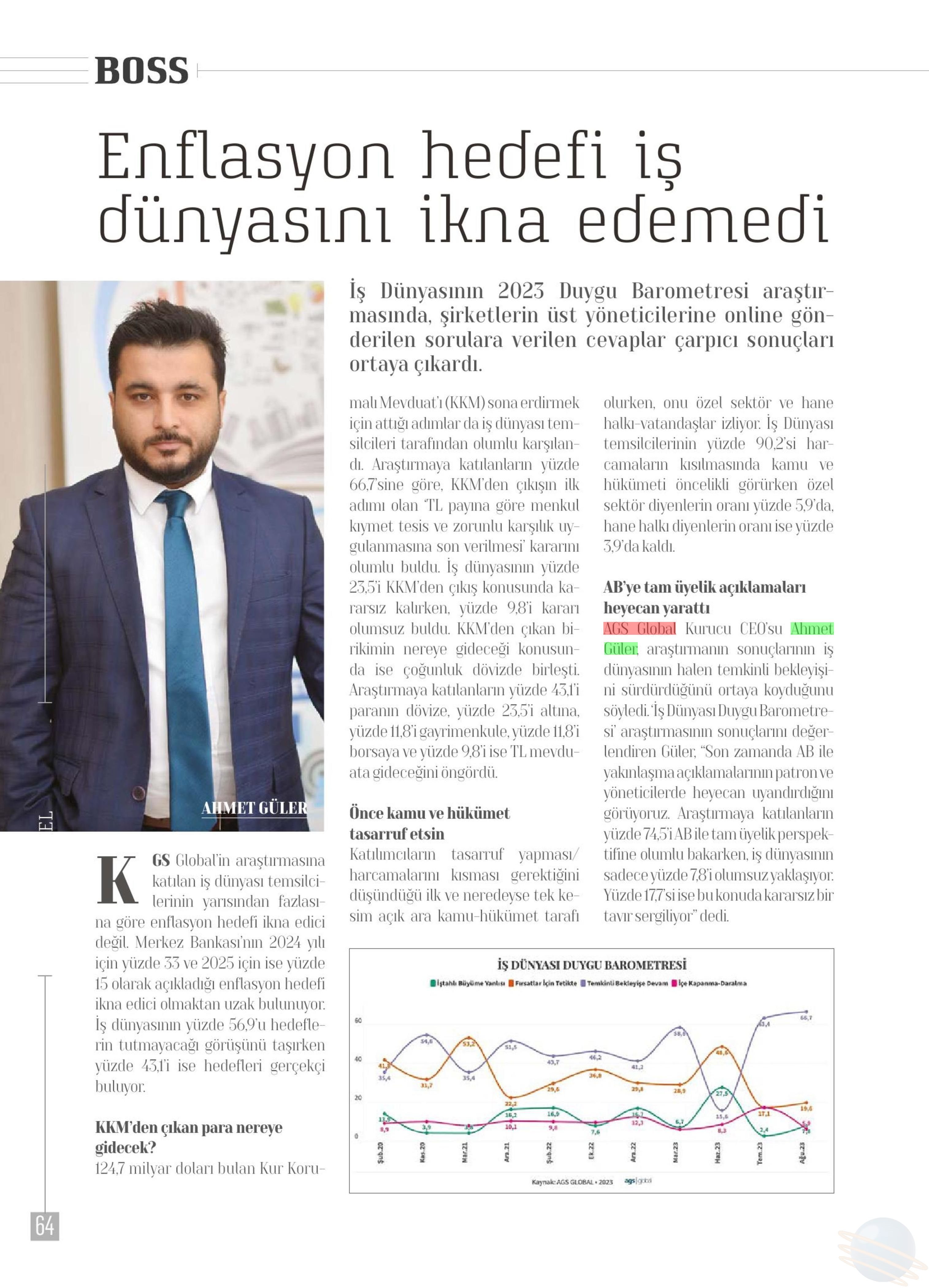 AGS Global Kurucu CEO’su Ahmet Güler, araştırmanın sonuçlarının iş dünyasının halen temkinli bekleyişini sürdürdüğünü ortaya koyduğunu söyledi. ‘İş Dünyası Duygu Barometresi’ araştırmasının sonuçlarını değerlendiren Güler, “Son zamanda AB ile yakınlaşma açıklamalarının patron ve yöneticilerde heyecan uyandırdığını görüyoruz. Araştırmaya katılanların yüzde 74,5’i AB ile tam üyelik perspektifine olumlu bakarken, iş dünyasının sadece yüzde 7,8’i olumsuz yaklaşıyor. Yüzde 17,7’si ise bu konuda kararsız bir tavır sergiliyor” dedi.