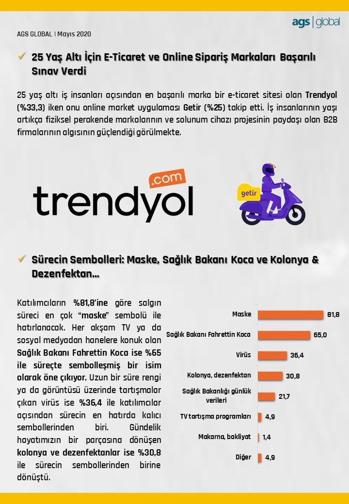 AGS Global Kurucu Ortağı Ahmet GÜLER, araştırmaya ilişkin yaptığı değerlendirmede; ‘İkinci faza geçtiğimiz şu günlerde firma sahipleri ve yöneticilerinin sadece güncel ekonomiye yönelik değil, aynı zamanda gündelik hayata dair tutum ve davranışları oldukça ilginç veriler sağlamış gözüküyor. Zamanın ruhunu çağıran araştırmamızla dijital hayatın ve çevrimiçi alışverişin bundan sonraki hayatımızda seyri, yerli ve milli ürün temayülü, endişeler, özlemler, korkular ve umutlar gibi insanımıza dair rasyonel ve irrasyonel gerçekliği harmanladık ve gelecekte bizi neyin beklediği içgörüsünü anlamlandırmaya çalıştık” derken, araştırma ile aynı zamanda süreç boyunca kolektif hafızada yer edinen sembolleri, yardım kampanyalarının etkinliğini, hükümetin, başkanlık sisteminin ve bilim kurulunun performanslarını ölçtüklerini ifade etti.