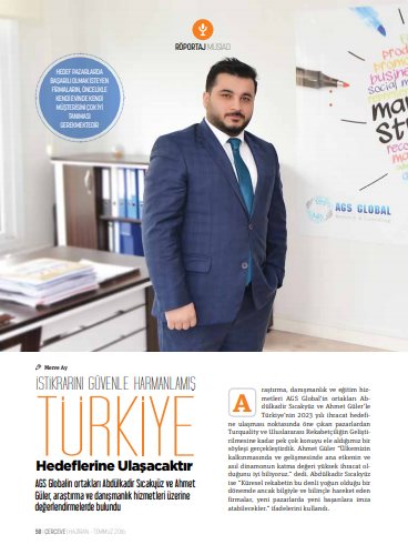 Ahmet GÜLER: Türkiye, geride bıraktığımız on yılda iktisadi ve siyasi olarak büyük başarılara imza attı. Ancak Türkiye’nin bulunduğu coğrafya son dönemde büyük dalgalanmalara ve çalkantılara maruz kaldı. Bilhassa etrafımızda cereyan eden çatışmalar, bizi ticaretten ziyade siyasi meselelerin içine çekiyor. Coğrafyamızın gerçeklerini göz ardı etmeden barış, güven ve istikrar adası olarak yolumuza devam etmeye mecburuz. Bu minvalde yoğun çaba sarf eden Hükümetimiz de ulaşılabilir hedefleri bir vizyon olarak kamuoyuna sundu. “Türkiye’nin 2023 Hedefleri”, bu vizyonun önemli bir parçasıdır. Hedeflerine ulaştığı takdirde kişi başına gelirini 25 bin dolara getirebilmiş, 500 milyar dolar ihracat yapan ve ilk 10 ekonomi içinde yer alan bir Türkiye, sadece kendisinin değil içinde bulunduğu Avrasya ve Orta Doğu için de çok büyük bir çekim merkezi olacaktır. Belirtilen bu hedeflere varmak için çok temel parametrelere ihtiyaç vardır. Örneğin, “verimlilik” başarılı olmanın en önemli etkenlerinden biridir. Dünya Ekonomik Forumu tarafından yayınlanan “Küresel Rekabet Endeksi”nde Türkiye 45. sırada yer almaktadır. Özellikle model almamız gerektiğine inandığımız Güney Kore ise 26. sıradadır. İhracat denilince akla gelen Almanya ise 5. sırada konumlanmıştır. Yine hedeflerimize ulaşmanın olmazsa olmazı Ar-Ge ve inovasyon çalışmalarıdır. Türkiye, Küresel İnovasyon Endeksi’ne göre 141 ülke arasında 58. sırada yer almaktadır. Bu veriler ışığında yapısal olarak verimli ve inovatif olmamız, ihracatımızın kilogram fiyat değerini artıracak ve bizi hedefe ulaştıracaktır. Ülkemizin kalkınmasında ve gelişmesinde ana etkenin ve asıl dinamonun katma değeri yüksek ihracat olduğunu çok iyi biliyoruz. Fırsat pazarlarına dönecek olursak, Osmanlı döneminde hinterlant olan bölgeler her zamanihracatta avantaj elde edebileceğimiz pazarlar olmaya devam etmelidir. Yakın havzamızda İran, bizim için önemli bir pazar olma potansiyeli taşımaktadır. Körfez ülkeleriyle ise son dönemde kurulan yakın ilişkilerimiz, dış ticaretimizde başta inşaat ve altyapı sektörlerine önemli fırsatlar sunmaktadır. İhracatta zirve partnerlerimizden Almanya ve İngiltere, gelişmiş ve istikrarlı olmaları nedeniyle Türkiye için son derece önemli pazarlardır. Bu ülkelerde ihracat rakamlarının çok daha yukarılara taşınması hem elzem hem de mühimdir. Bu nedenle AGS Global olarak Berlin ve Londra’da temsilcilik açtık. Bizce, Almanya ve İngiltere’de iş yapan firmalarımız dünyanın her tarafında rahatlıkla ürünlerini pazarlayabilirler. Ayrıca ABD, henüz potansiyel ihracatımızı kinetiğe çeviremediğimiz büyük bir ekonomidir. Burada dünya nüfusunun önemli bir kısmını barındıran ve önümüzdeki yıllarda büyüyen orta gelir sınıfıyla dünya ekonomisinin ağırlık merkezi olacak Asya-Pasifik Bölgesi’ne ekstra parantez açmakta fayda var. Tüm gelişmeleri yakından takip eden, dinamik ve istikrarını güvenle harmanlamış bir Türkiye, hedeflerine ulaşacaktır. Özetle; AGS olarak özellikle diyoruz ki “Hattı ticaret yoktur, sathı ticaret vardır. O satıh tüm dünyadır.”