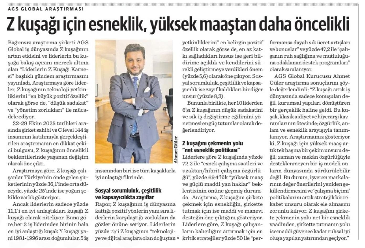 22-29 Ekim 2025 tarihleri arasında şirket sahibi ve C level 144 iş insanının katılımıyla iş dünyasında Z kuşağının artan etkisini ve liderlerin bu kuşağa bakış açısını mercek altına alan "Liderlerin Z Kuşağı Karnesi" başlıklı gündem araştırmamız yayınlandı.